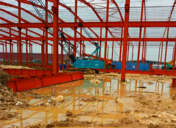 負責印尼加工中心建設工作的生產部經理張華說:“咱們對印尼的高溫多雨天氣真是欲哭無淚啊。”印尼地處赤道附近,熱帶雨林氣候特征明顯,一年中有半年在下雨,在路上走幾步就有細密的水珠往外冒。而加工中心所在的園區沒有市政排水設施,如果連續降雨,積水深處可達半米左右?;油诰蚬こ陶s上雨季,往往今天好不容易挖完的大基坑,大雨一沖,坑邊疏松的泥土塌方,一夜間就會恢復原狀,施工進度遠遠落后于目標。