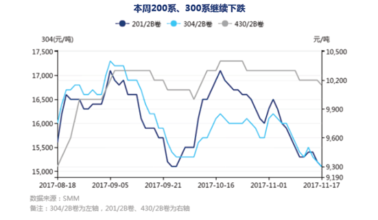 代理商對不銹鋼后市態(tài)度偏悲觀,向鋼廠提貨謹慎;同時臨近年底資金面抽緊,資金面制約代理商大量提貨, 200系、300系不銹鋼價格重心下移。